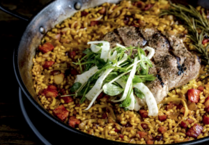 Pella Tres Cerditos chorizo, smoked belly, shoulder chop, leeks, apple cider, saffron, and rice! This dish will leave you scraping the bottom of the pan wanting more. Pella portions are quite large, making it perfect for sharing.